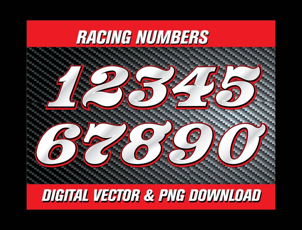Digital download for a racing-style font created for numbers. Includes each individual number as a transparent background PNG file and includes an SVG and PDF file, both layered. Can be opened with a vector editing program such as Adobe Illustrator or Photoshop.